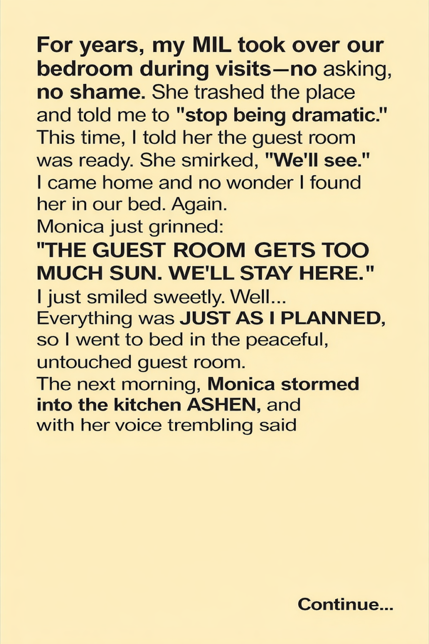 Last night, I’d called Monica and told her clearly, “WE’VE SET UP THE GUEST ROOM FOR YOU. IT’S CLEAN, COZY, AND PRIVATE. WE’RE KEEPING OUR BEDROOM TO OURSELVES.”“We’ll see when we get there, dear,” she’d said. Her voice dripped with condescension, a promise of future defiance.