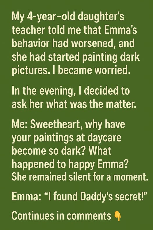 My 4-year-old daughter’s teacher told me that Emma’s behavior had worsened, and she had started painting dark, unsettling pictures. Concern wrapped itself around my heart like a vice. That evening, as I tucked her in, I decided to gently ask what was troubling her.