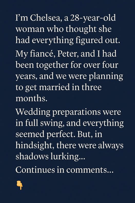 I’m Chelsea, a 28-year-old woman who thought she had everything figured out. My fiancé, Peter, and I had been together for over four years, and we were planning to get married in three months.