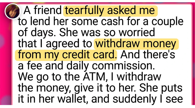 A friend tearfully asked me to lend her some cash for a couple of days. She was so worried that I agreed to withdraw money from my credit card. And there’s a fee and daily commission. We go to the ATM, I withdraw the money, give it to her.
